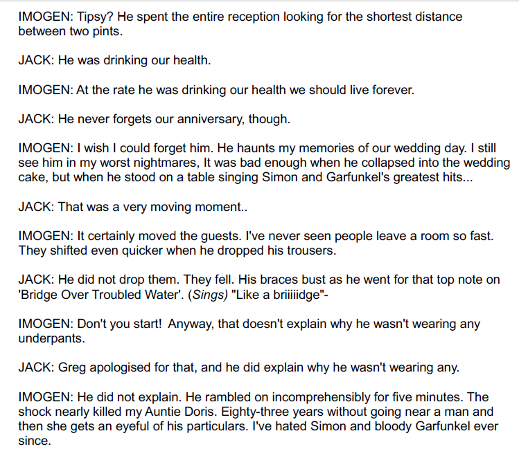 Meanwhile, I’ve been busy working on my next stage play, provisionally entitled ‘Wedded Blitz’ about a novelist suffering from writer’s block whose second marriage is about to hit the rocks as he hits the bottle. The first draft is now complete – so I’ll give it the acid test i.e. let Caroline read it. If she likes it enough I’ll be arranging for some of Newport Playgoers’ finest to get together for a reading – and looking forward to their invaluable feedback.