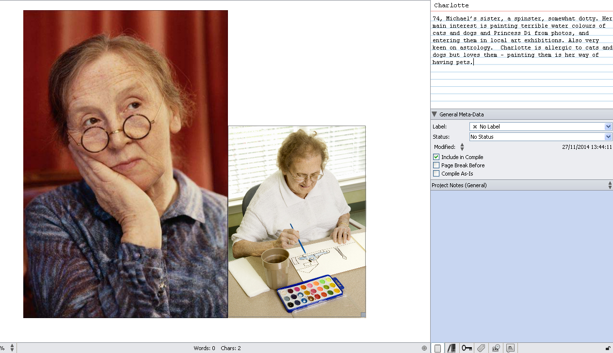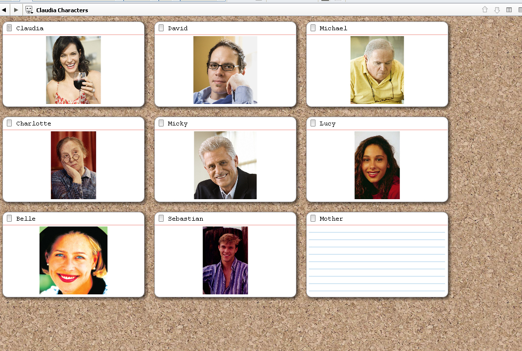 Scrivener proves invaluable here. I’ve created a template for stage plays which includes a folder for characters. It’s easy to add a character, name them and then drag in a photo of how I think they look. Next I use a character sheet to put flesh on the character.