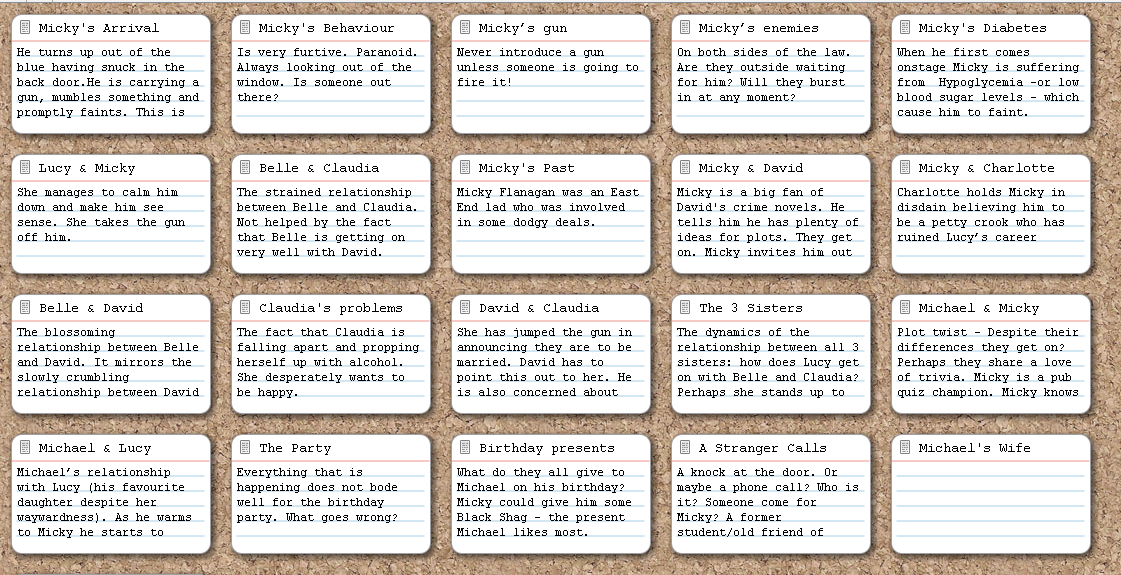 For me, once I have an idea of the story, character comes first – characters are where the plot springs from – so I spend a long time working on this aspect of a play. I tend to give them the first name that springs into my head (often changed later). I use photos that I think capture the way a character looks and sounds. I build up their profile – likes, dislikes, biography, secrets, what they want – and, most importantly, what’s stopping them from getting what they want. Often ideas for the plot will spring from these notes.