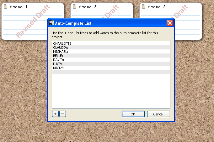 With Scrivener, you simply open up Project/Auto-complete List and add all your characters’ names (I always include colons as well) and when you type the first letter of the name up it pops, you press return and it’s there. Leaving you free to concentrate on the important stuff – what they’re going to say.